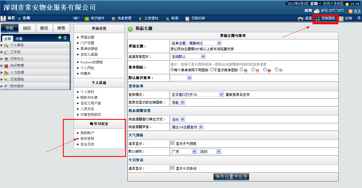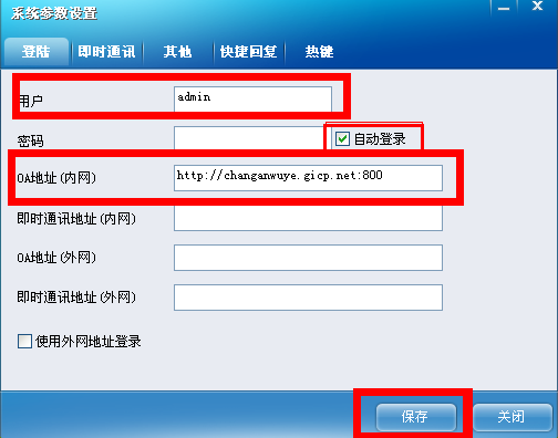 (4)OA地址(內(nèi)網(wǎng))修改成下面內(nèi)容[changanwuye.gicp.net:800]。用戶名首次登陸為自己的名字,沒(méi)有密碼。點(diǎn)擊保存。就可以直接登錄了。