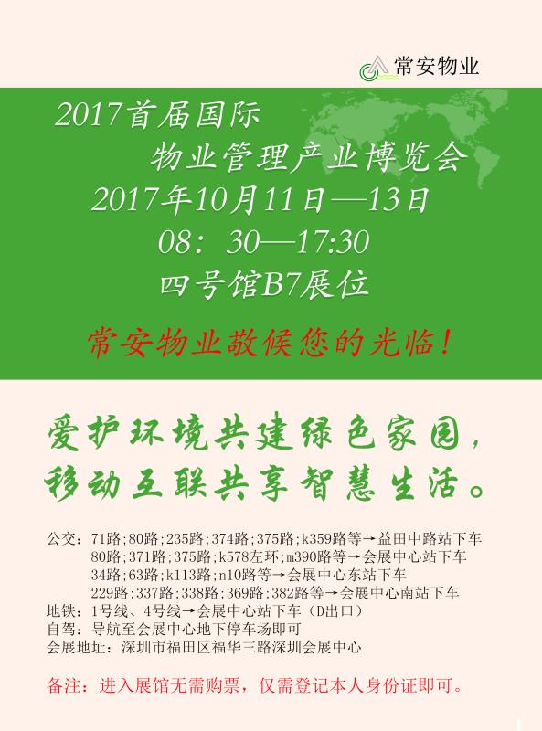 2017首屆國際物業(yè)管理產(chǎn)業(yè)博覽會(huì)于今日在深圳市會(huì)展中心舉辦,常安物業(yè)在此敬候您的光臨!??!