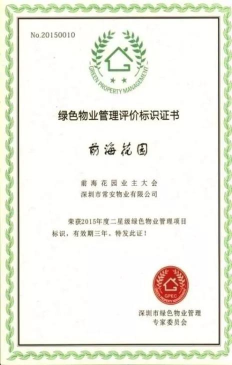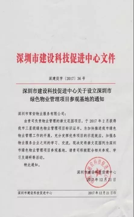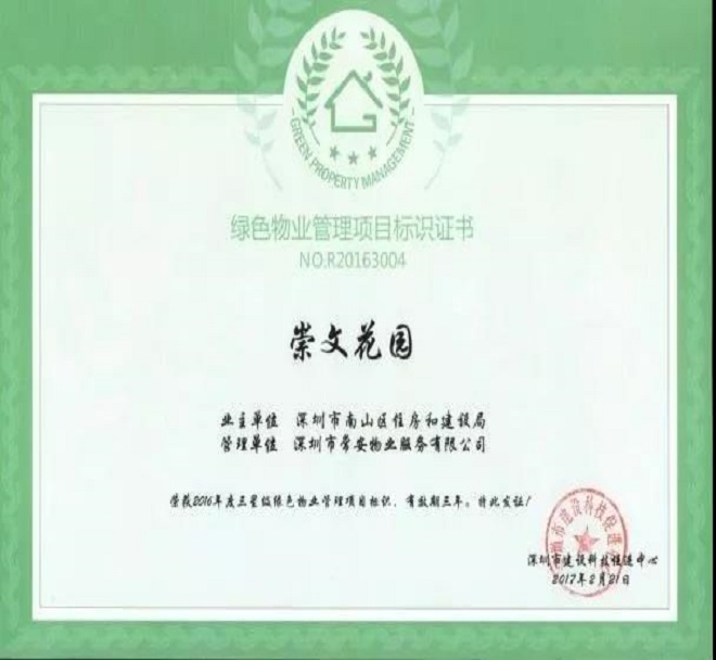 依據(jù)2011 年深圳出臺(tái)的首部《深圳市綠色物業(yè)管理導(dǎo)則(試行)》和 2013 年出臺(tái)的《深圳市綠色物業(yè)管理項(xiàng)目評(píng)價(jià)辦法和細(xì)則(試行)》,常安物業(yè)積極響應(yīng)并開展綠色物業(yè)管理工作,2016 年至今,共有四個(gè)項(xiàng)目榮獲了深圳市政府部門頒發(fā)的綠色物業(yè)管理項(xiàng)目證書,其中崇文花園還被深圳市政府部門列為深圳市綠色物業(yè)管理項(xiàng)目參觀基地,2019年出任廣東省綠色供應(yīng)鏈協(xié)會(huì)綠色物業(yè)管理專業(yè)委員會(huì)副主任委員單位。色物業(yè)管理