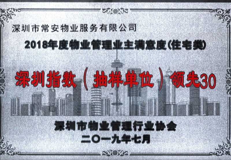 物業(yè)管理業(yè)主滿意度深圳指數(shù)測評工作已結(jié)束。以此次深圳指數(shù)測評所有樣本為主,結(jié)合深圳綜合實力 50強滿意度測評、優(yōu)秀項目達標驗收滿意度測評及自主參與滿意度測評所涉及的樣本進行統(tǒng)計,根據(jù)測評結(jié)果,我司榮獲“2018年度物業(yè)管理業(yè)主滿意度(住宅類)深圳指數(shù)(抽樣單位)領(lǐng)先30”的榮譽稱號。
