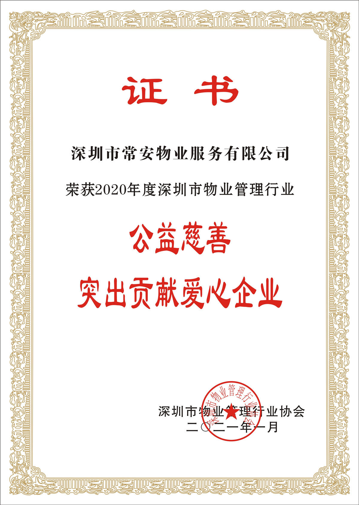 為貫徹國家脫貧攻堅整體部署,響應政府、行業(yè)黨委、協(xié)會等有關部門號召,在發(fā)展企業(yè)經營的同時,深圳市常安物業(yè)服務有限公司弘揚中華民族團結互助、扶貧濟困的精神,積極履行自身的社會責任。為表彰常安物業(yè)在公益慈善方面的突出貢獻,深圳市物業(yè)管理行業(yè)協(xié)會特授予常安物業(yè)“2020年度深圳市物業(yè)管理行業(yè)公益慈善突出貢獻愛心企業(yè)”榮譽稱號。